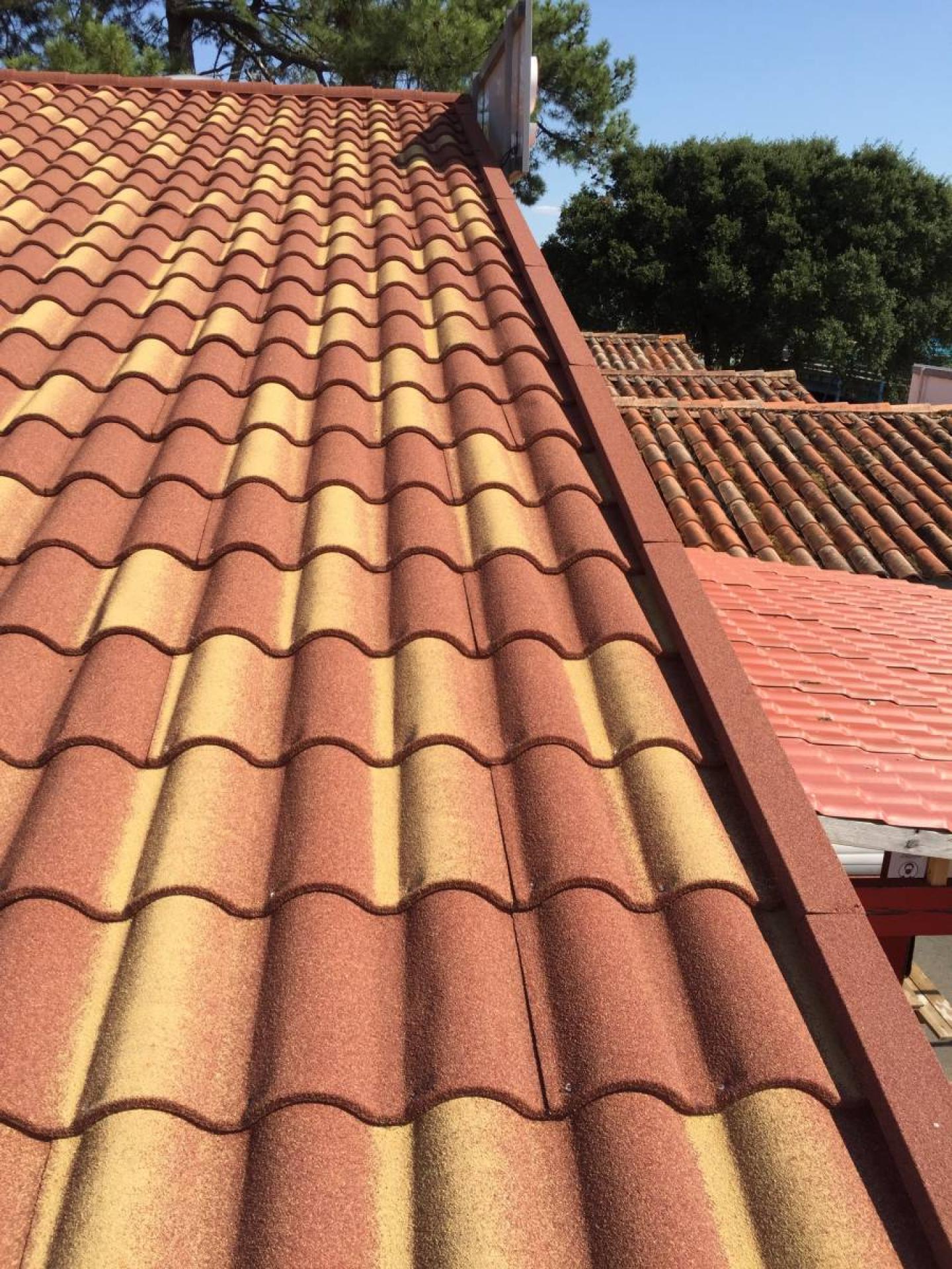 La toiture de ce supermarché SPAR située à LABENNE-OCEAN a été refaite par l'entreprise DUPOUY à ONDRES avec des tuiles métalliques canal METROTILE modèle ROMANA en couleur TUSCANY. La toiture est de faible pente.