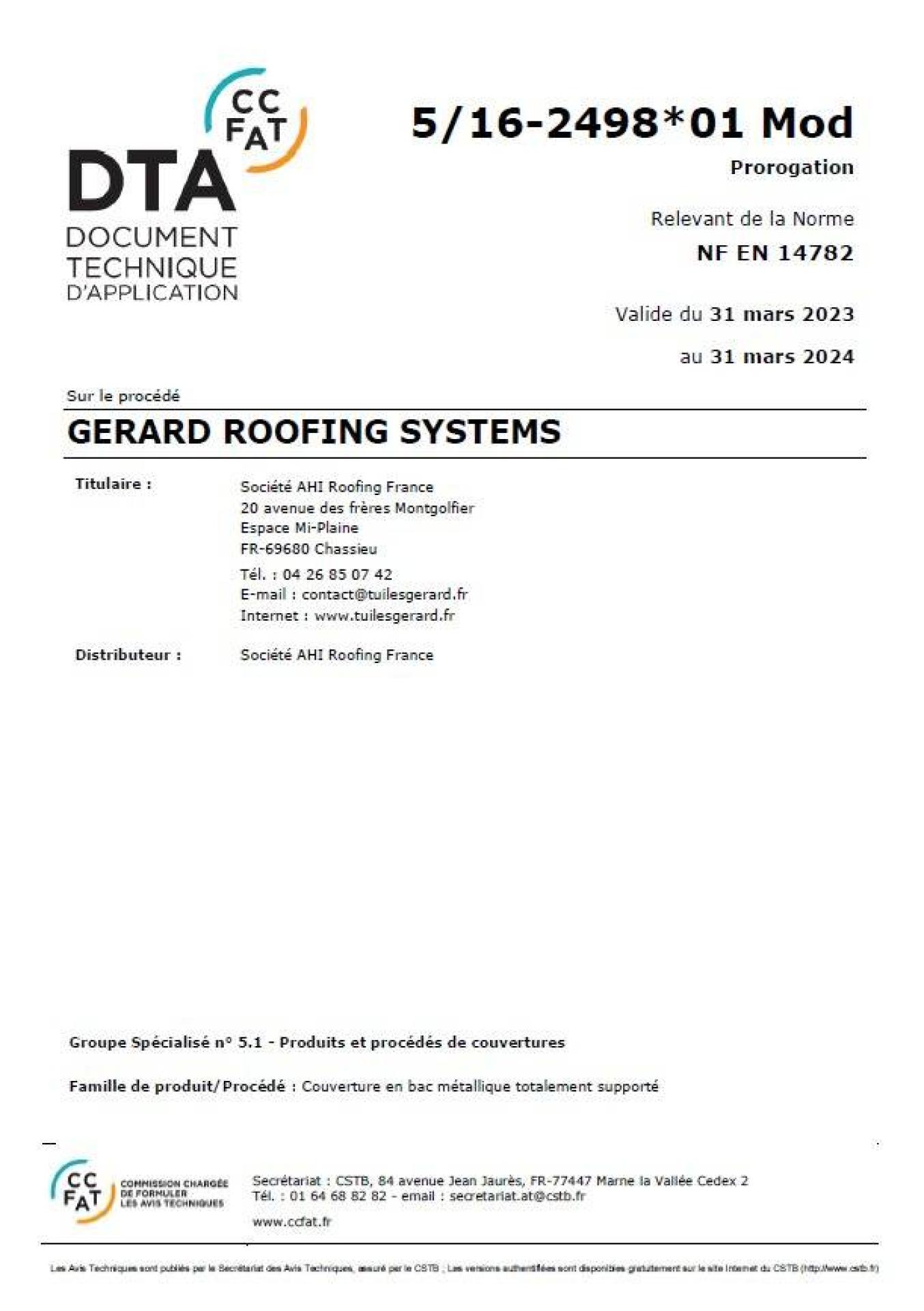 Prorogation Avis Technique CSTB 5_16_2498 GERARD Roofing Systems
