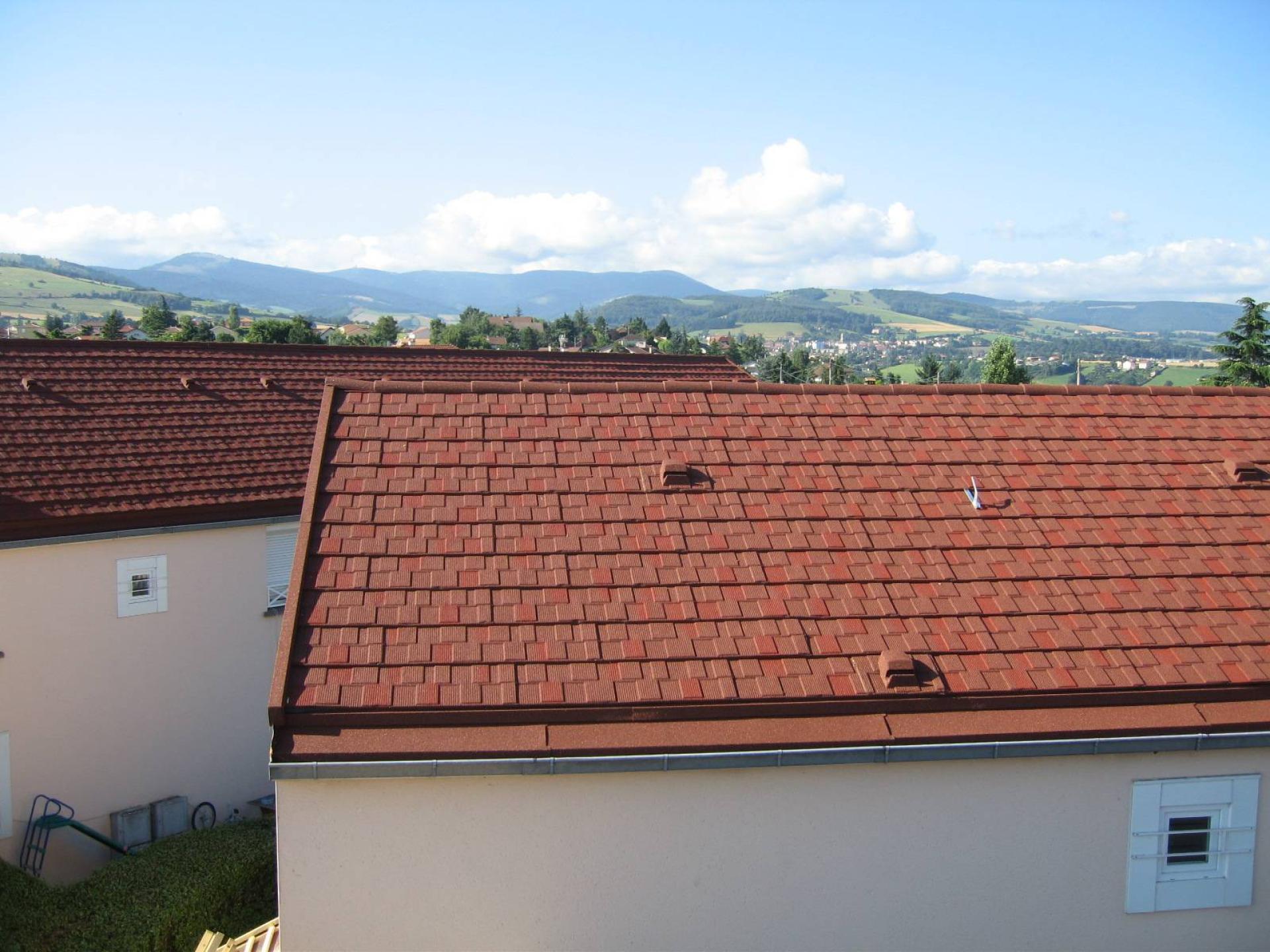 Les toitures étaient à l'origine couvertes de shingle bitumineux pour ce lotissement constitué de plusieurs logements gérés par l'office public de l'habitat du département de la Loire.