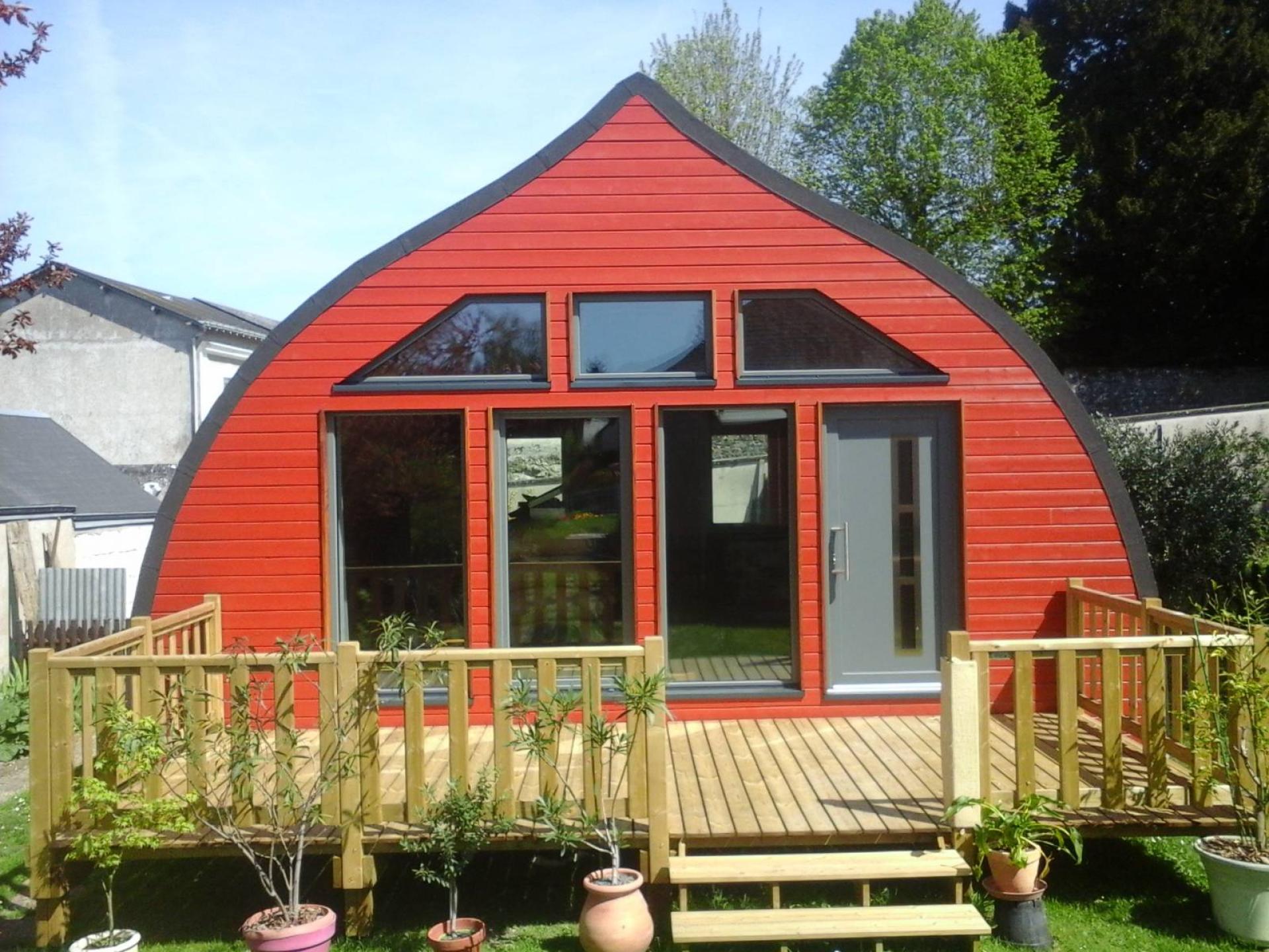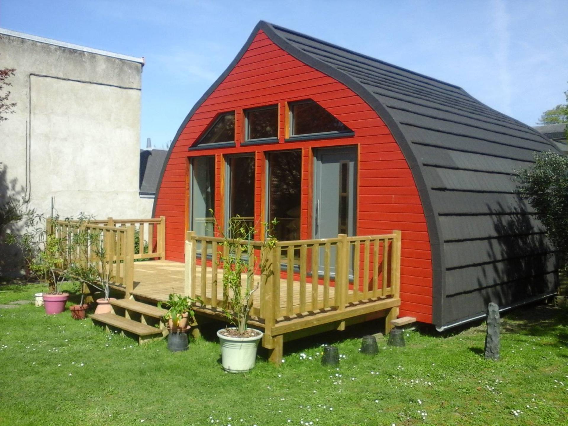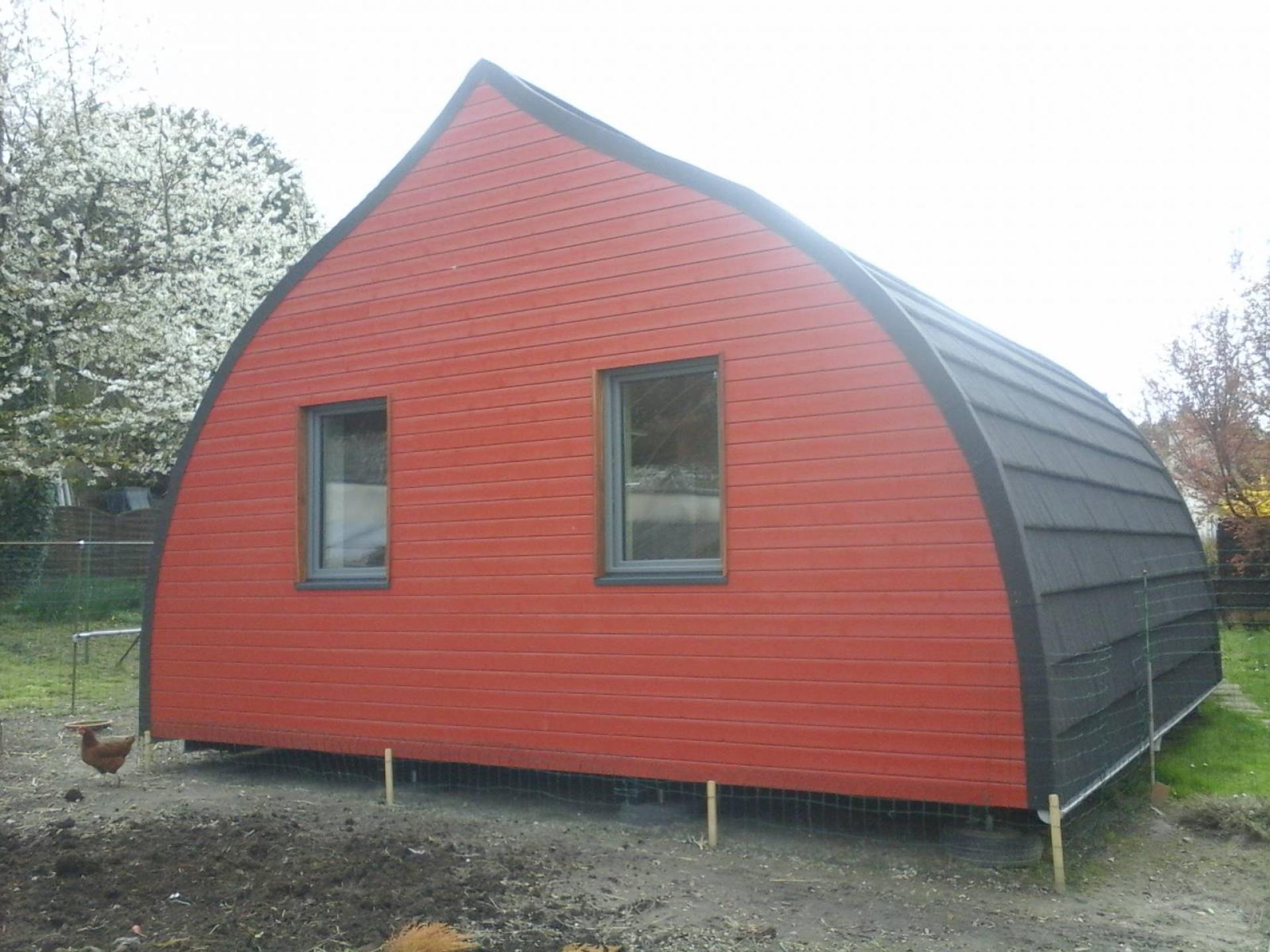 Les Tuiles GERARD s'adaptent facilement sur ce genre de toiture cintrée en ogive car à chaque rang correspond une inclinaison différente. Les bandes de rive crantées droites et gauches ont été coupées verticalement en face de chaque rang et façonnée en suivant la courbe de la toiture. Conseil COCCI Bois pour cette réalisation.