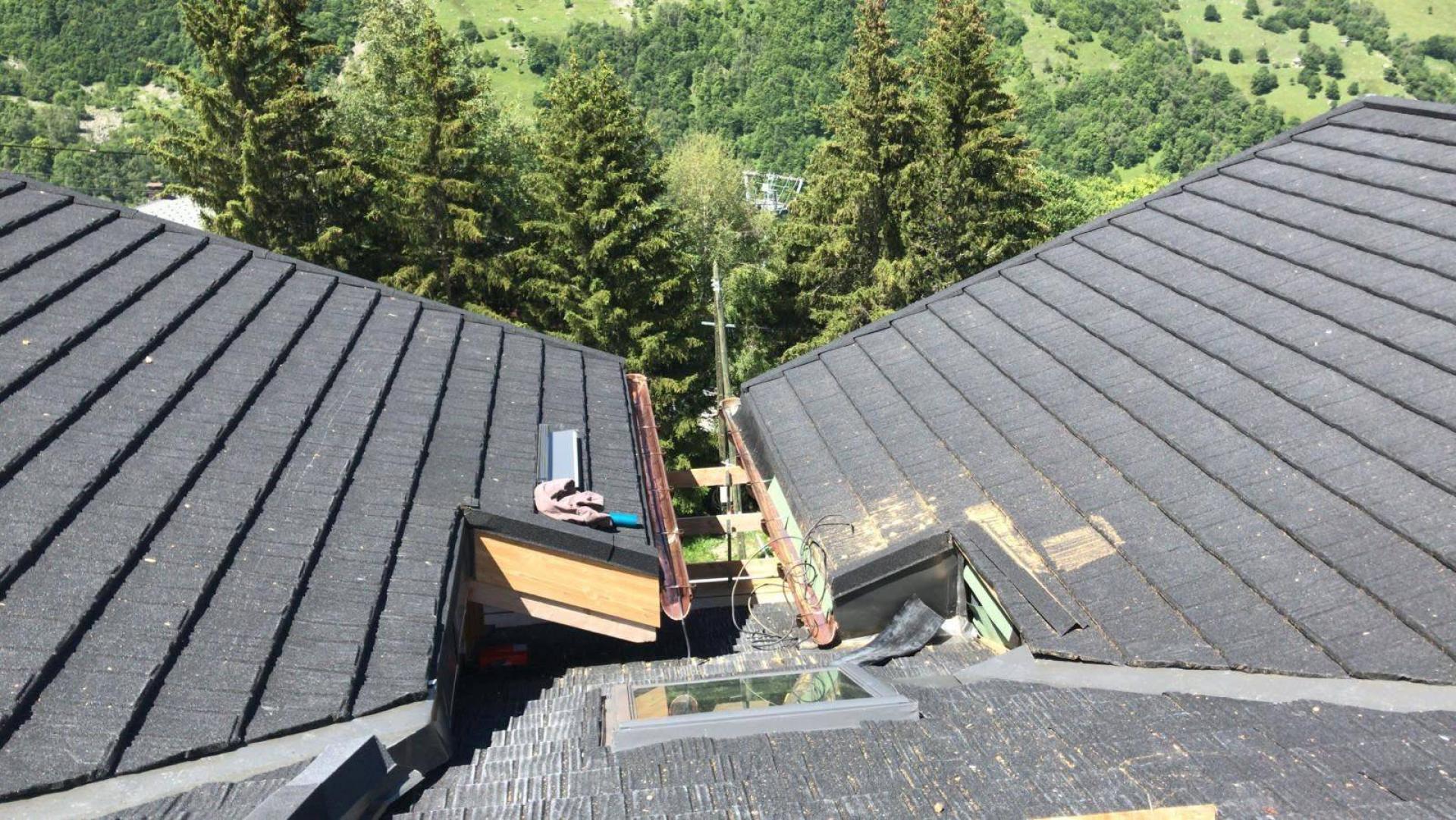 Une toiture de montagne réalisée en lauze métallique GERARD CORONA dans la station des Ménuires pour le Chalet Lodge PureValley qui offre des habitations haut de gamme.