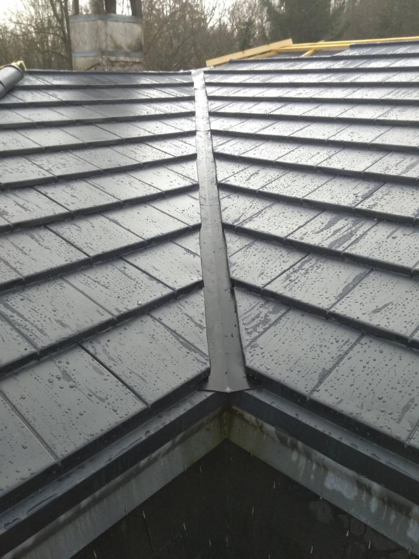 Le support de liteaux est identique à des tuiles traditionnels de terre-cuite ou de béton. Les noues et les arêtiers comme sur cette toiture sont gérées aussi facilement qu'avec des tuiles classiques.