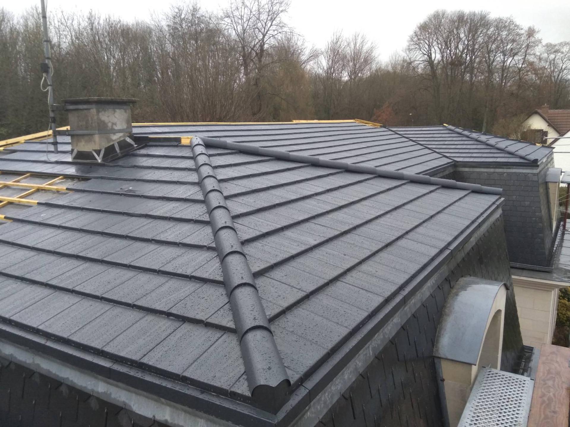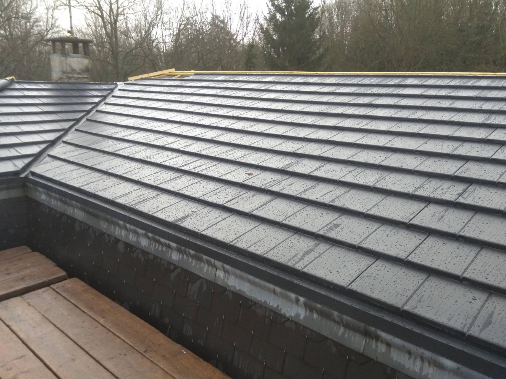 Terrasson de toiture de maison de maître réalisé en tuiles métalliques plates du modèle METROTILE QUBE ACOUSTIC.