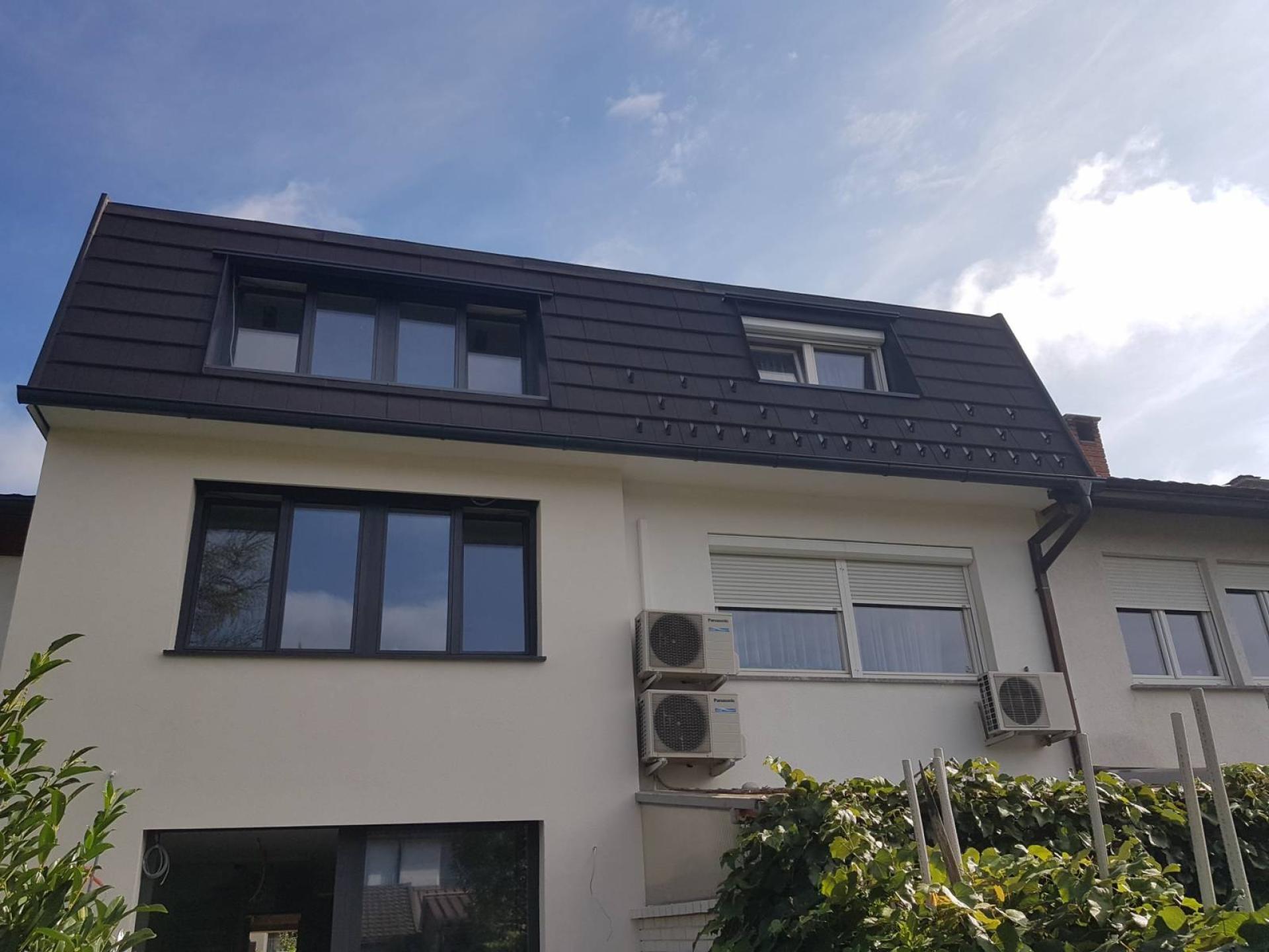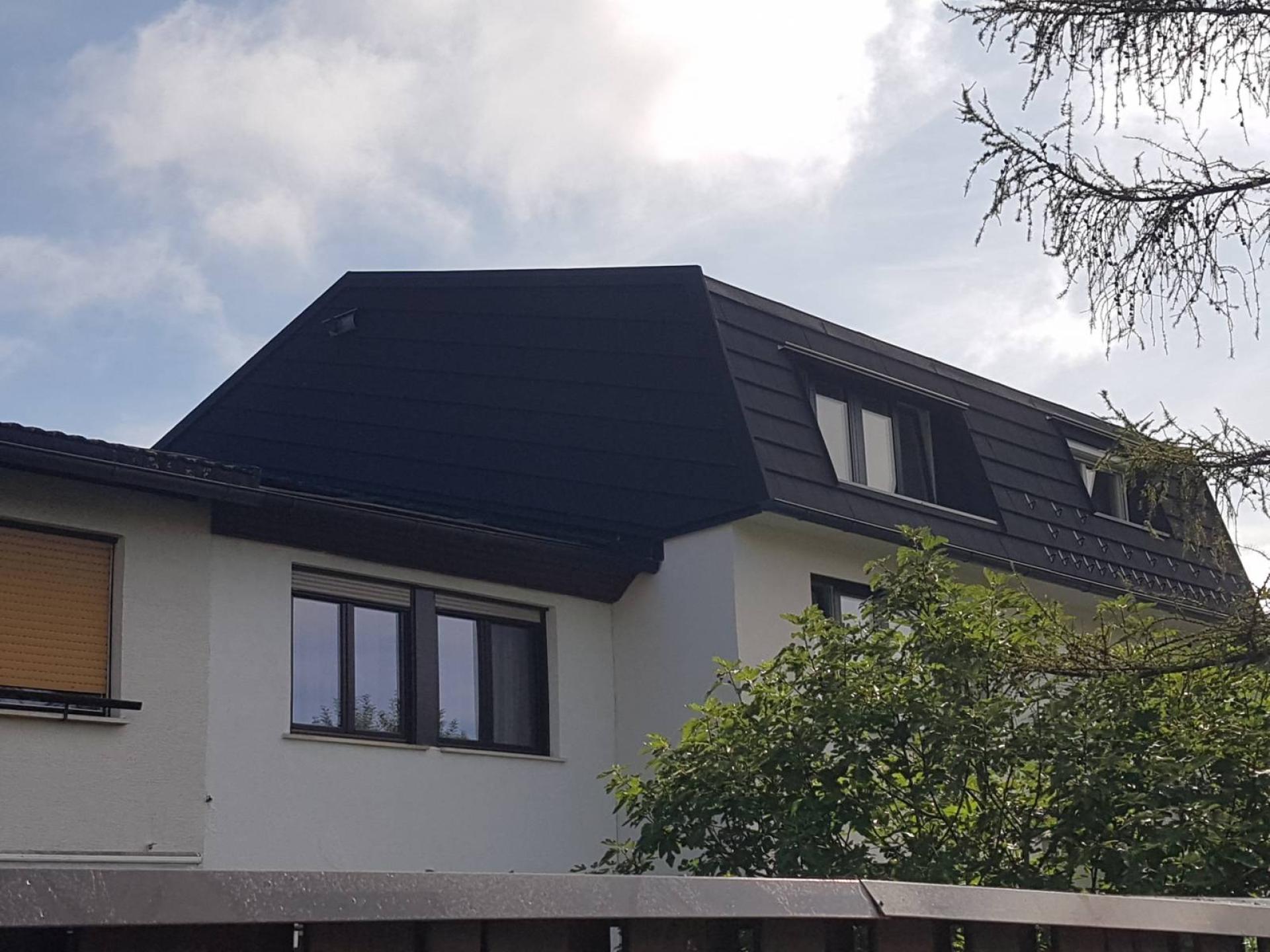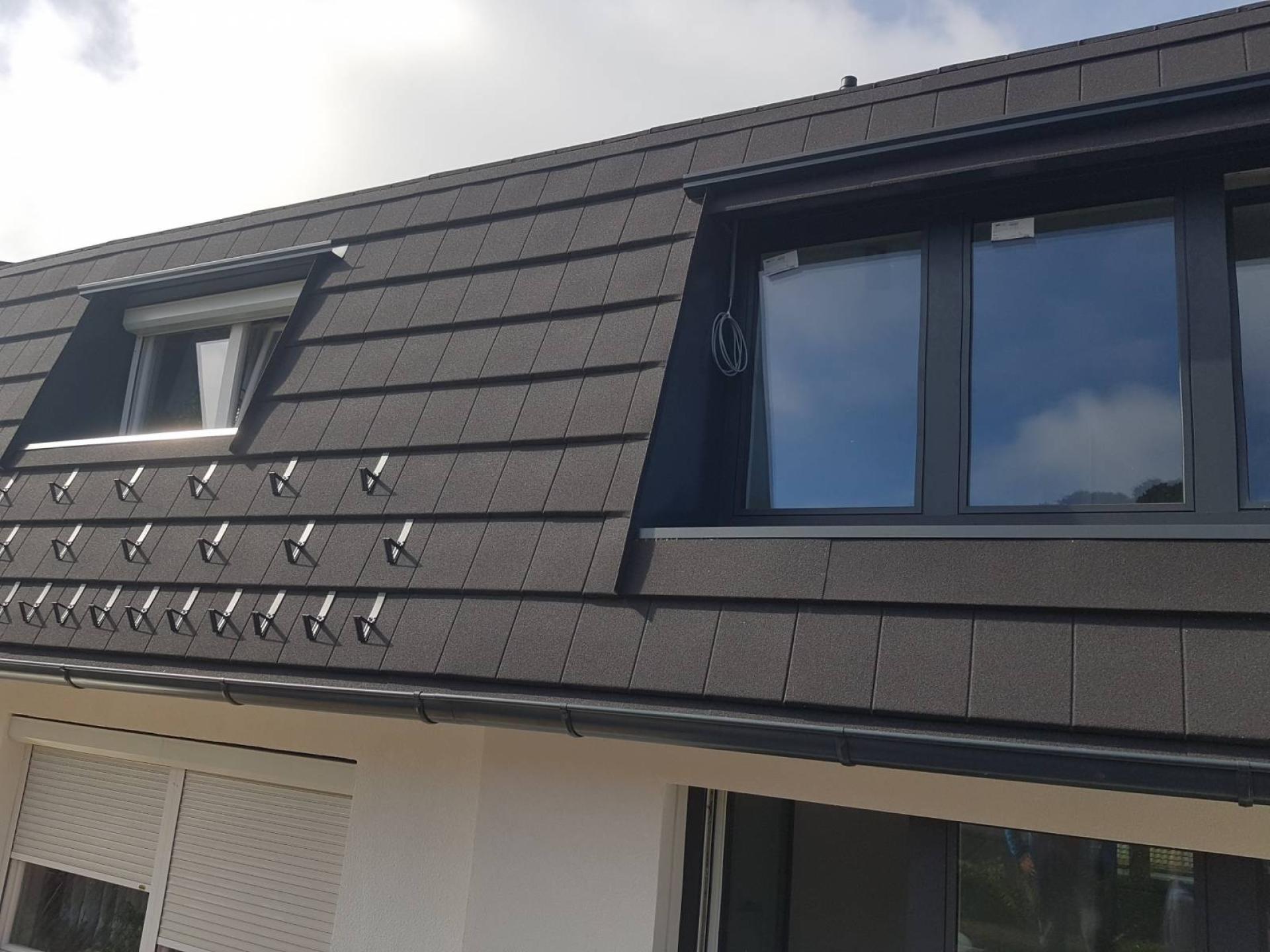 Ce brisis de toitures à été réalisé en tuiles métalliques plates du modèle GERARD ELEGANTA de couleur BLACK (ardoisé), la pose ici est à joints alignés.