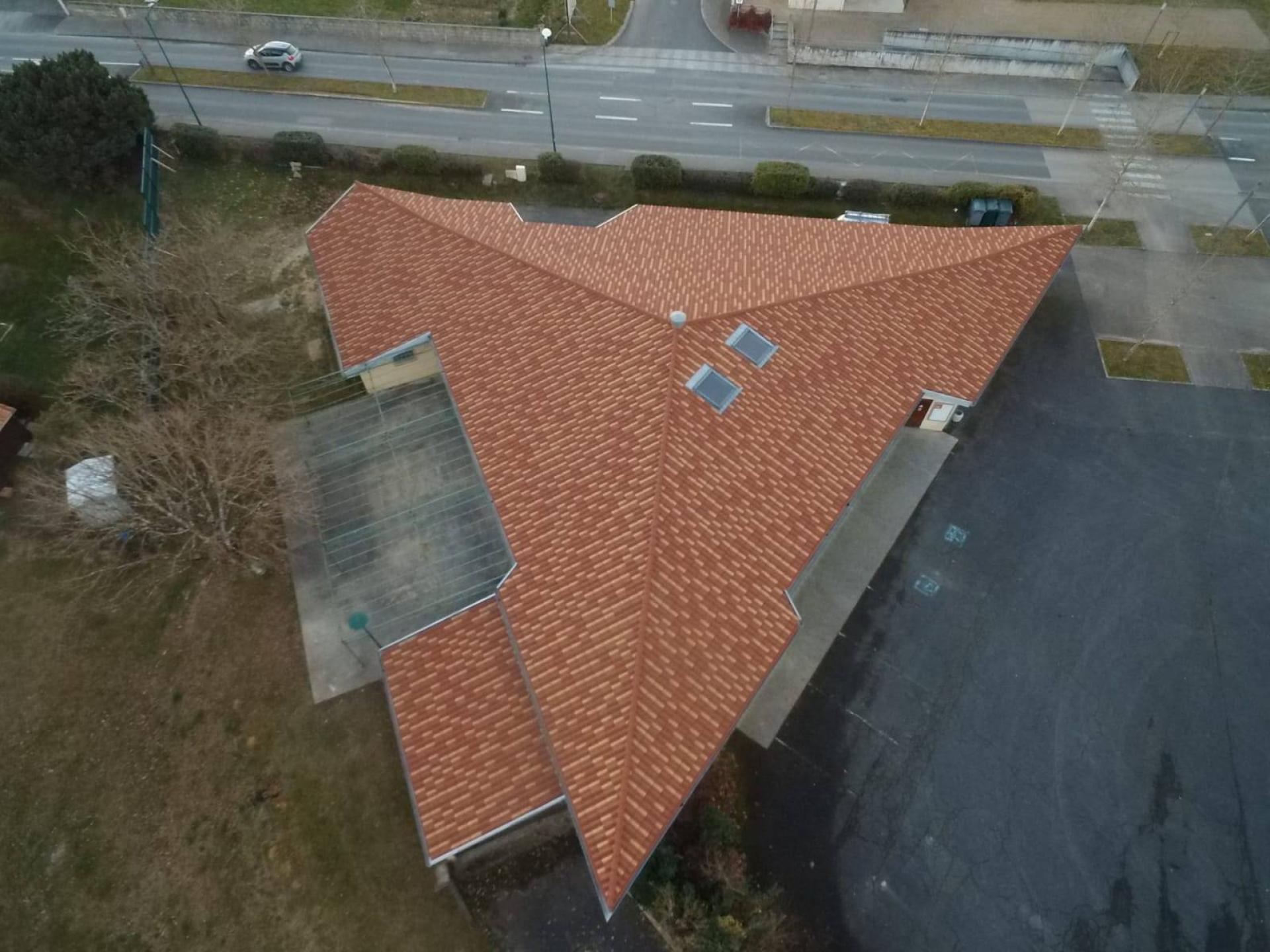 Cette grande toiture de salle polyvalente en tuiles métalliques METROTILE ROMANA a une forme inédite puis qu'elle est triangulaire avec des pointes qui remontent à la façon d'une pagode.