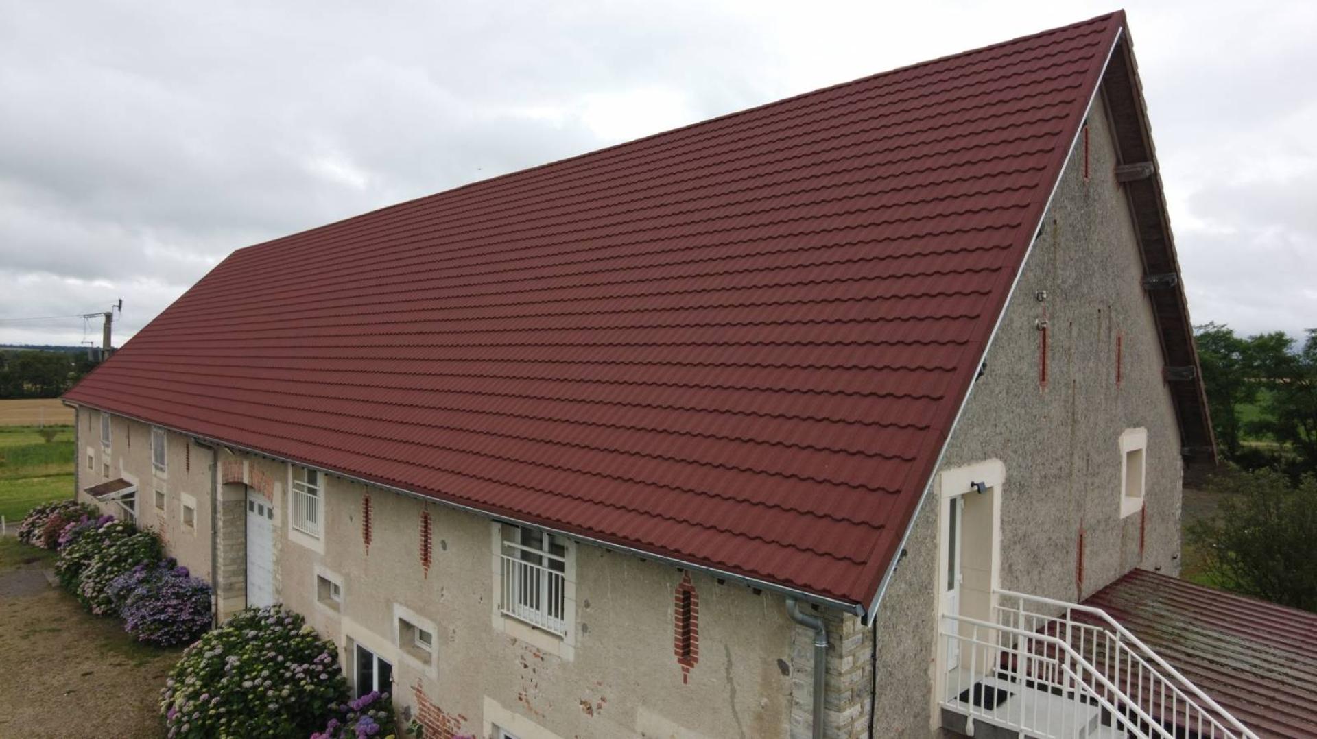 Le propriétaire a choisi les tuiles métalliques GERARD du modèle HERITAGE pour leur résistance à la grêle et aux tempêtes, pour leur légèreté avec leur poids de 7 kg par m2 et également pour leur aspect esthétique. Elles imitent parfaitement les tuiles de terre-cuite grand moule.