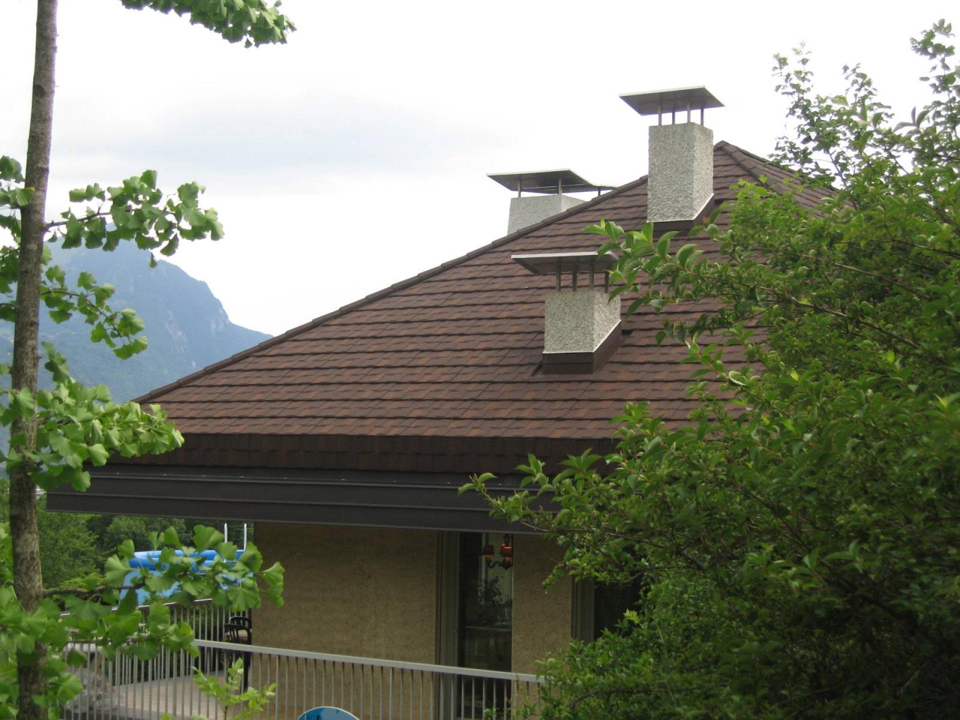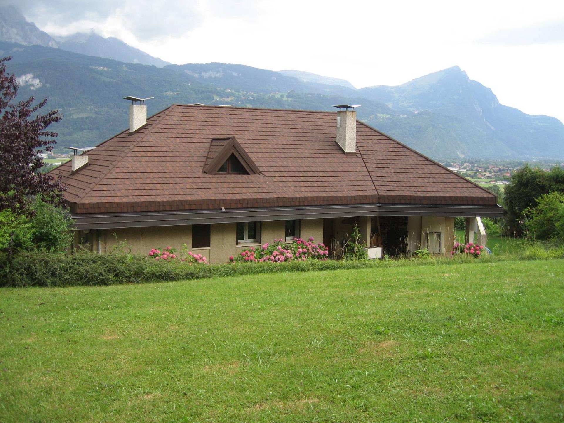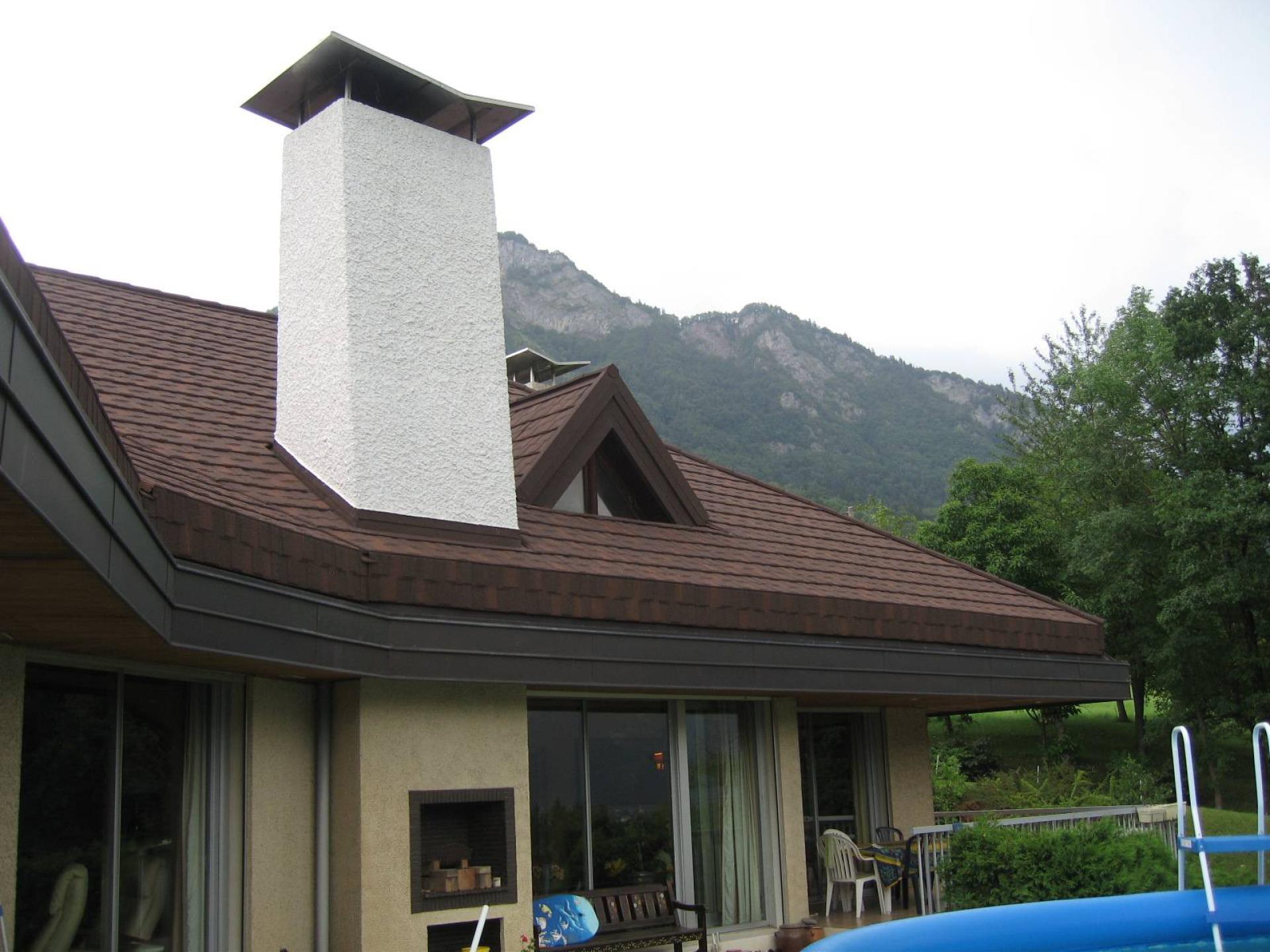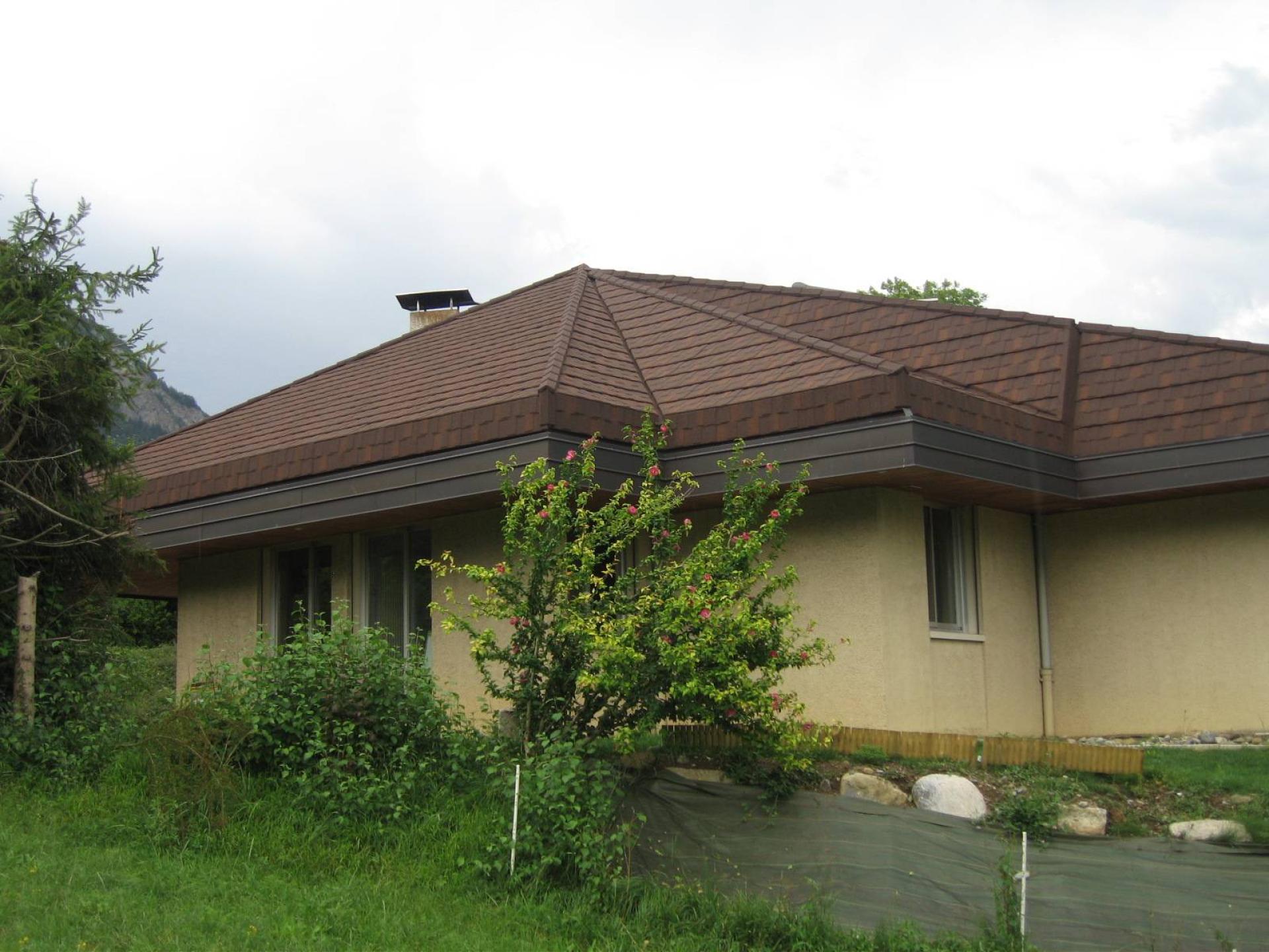 Une toiture réalisée en shingle métallique GERARD® SENATOR de couleur Bark pour cette maison contemporaine avec sa toiture à l'architecture très complexe avec ses parties triangulaires à l'arrière et sur les côtés.